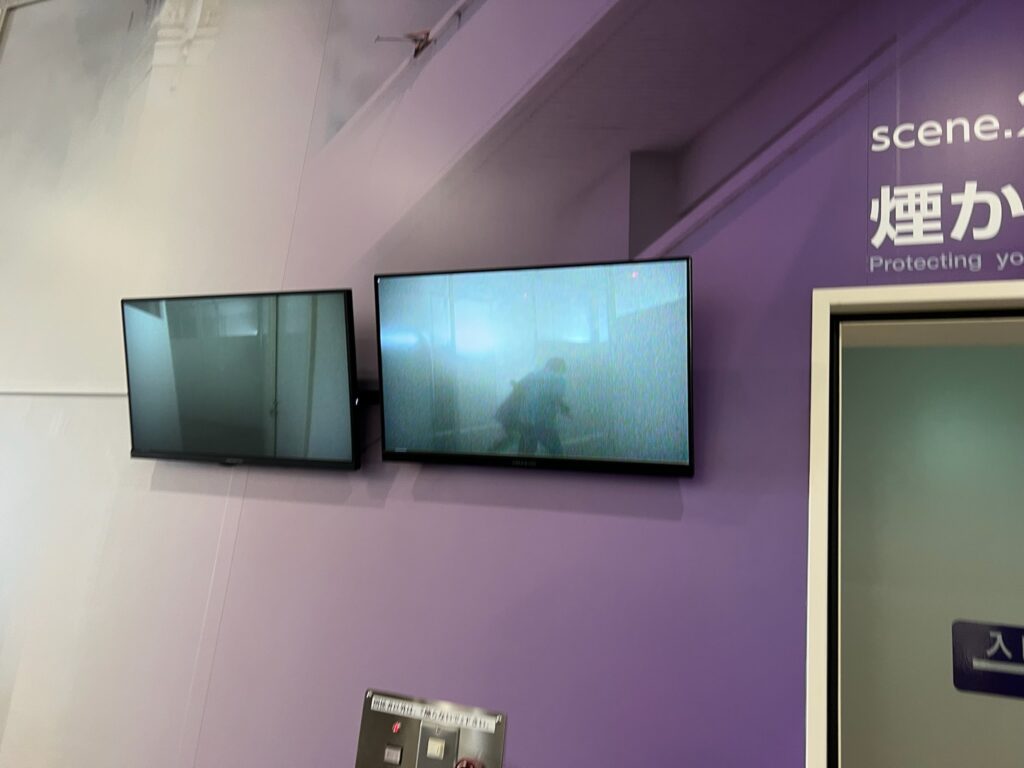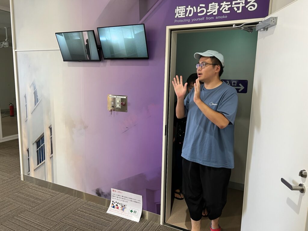 火災が発生すると、停電になることが多いので、暗くて煙が充満した迷路のような部屋を移動する練習です。