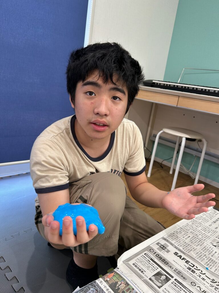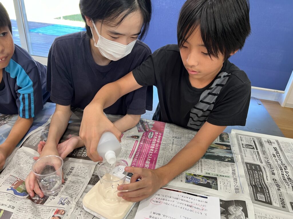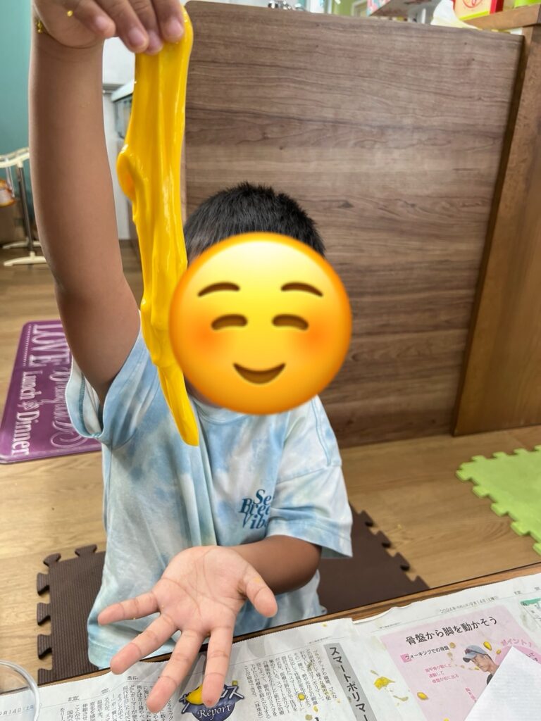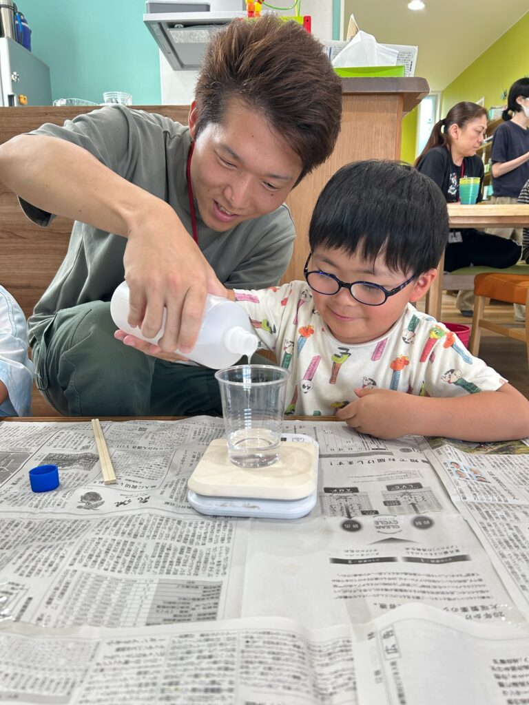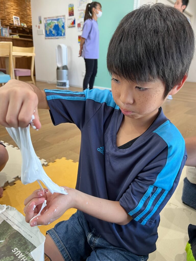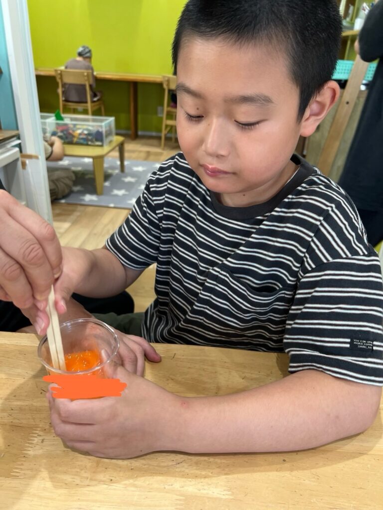 まずは説明を聞き、スライムの素を作る作業から入ります。ホウ砂と水のりを加え、まぜまぜ、、、⭐️