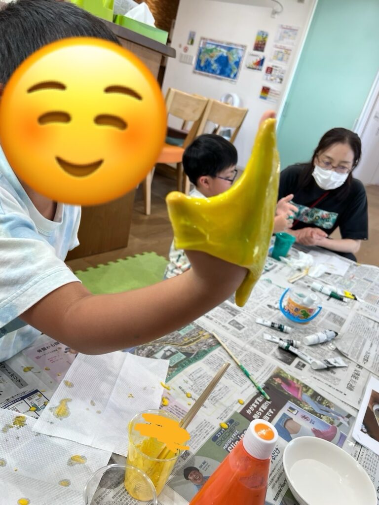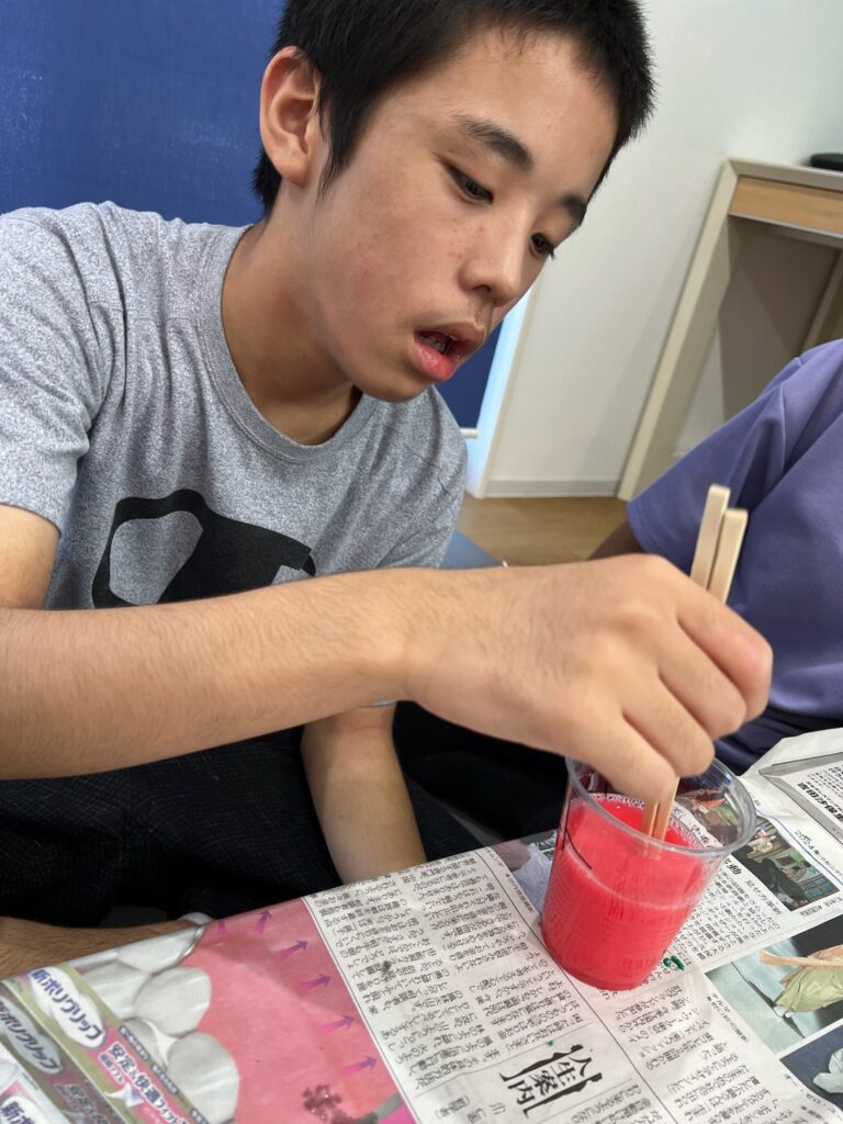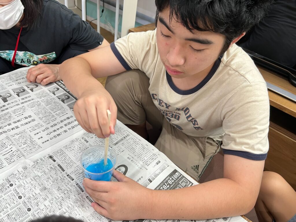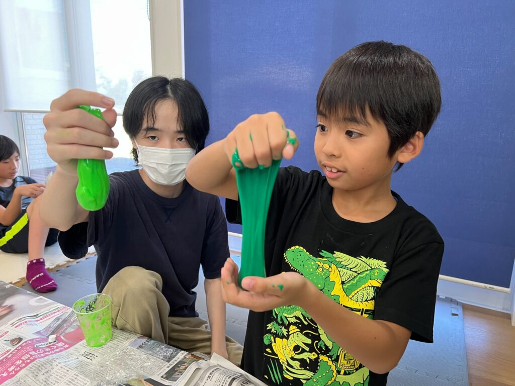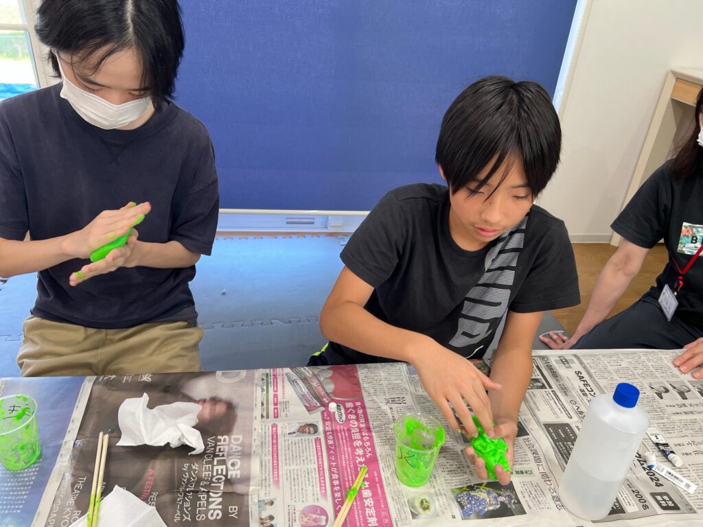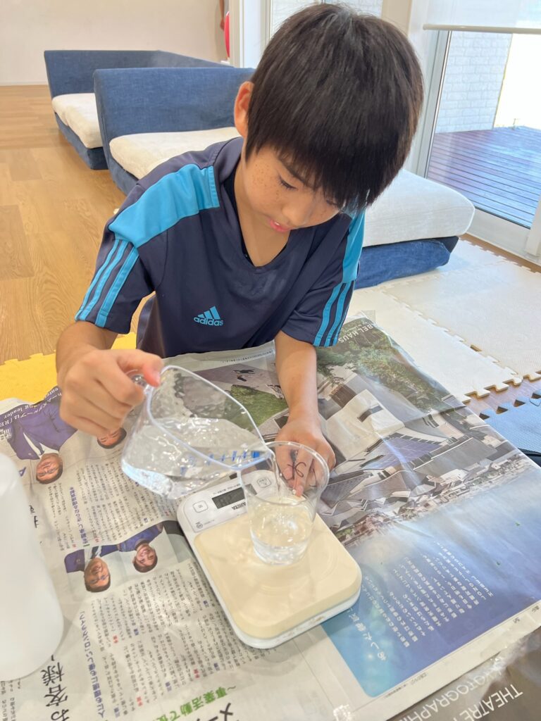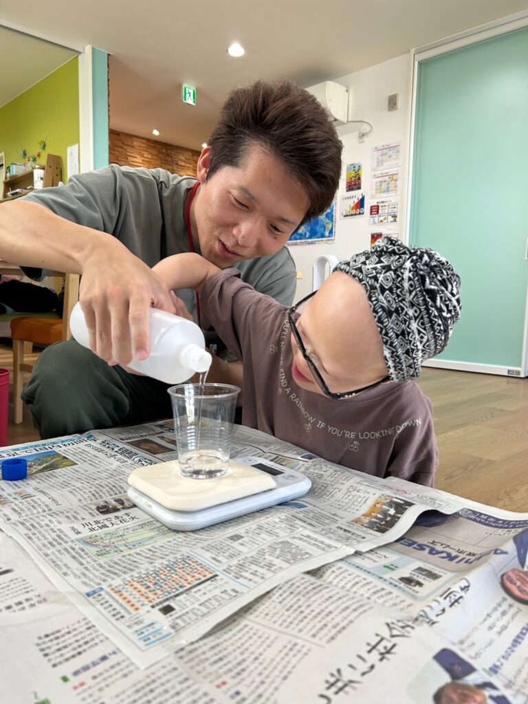 まずは説明を聞き、スライムの素を作る作業から入ります。ホウ砂と水のりを加え、まぜまぜ、、、⭐️