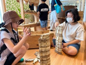 お魚の形のつみきや木の玉のプール・いろんな木で作られた楽器などに触れて楽しんでいます😆