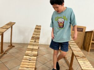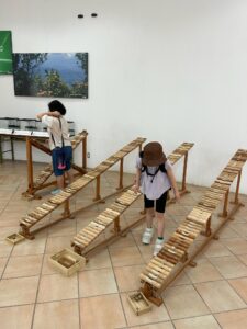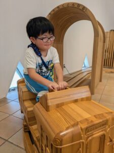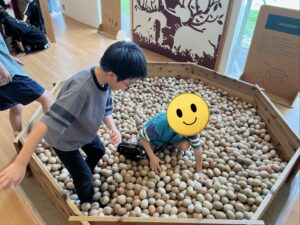 お魚の形のつみきや木の玉のプール・いろんな木で作られた楽器などに触れて楽しんでいます😆