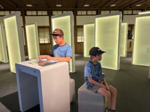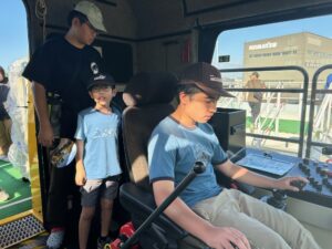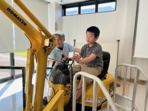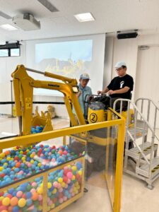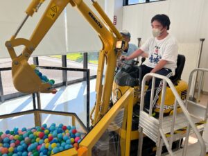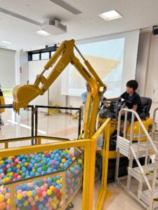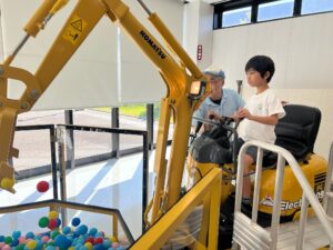 「コマツ未来館」ではミニショベルに乗ってボールをすくう操縦体験をしたり、シュミレーションゲームもできました。