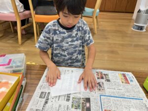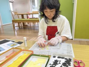 まずはトレーシングペーパーを半分に折り、片面全体に、ちぎったお花紙や折り紙を貼って行きます。