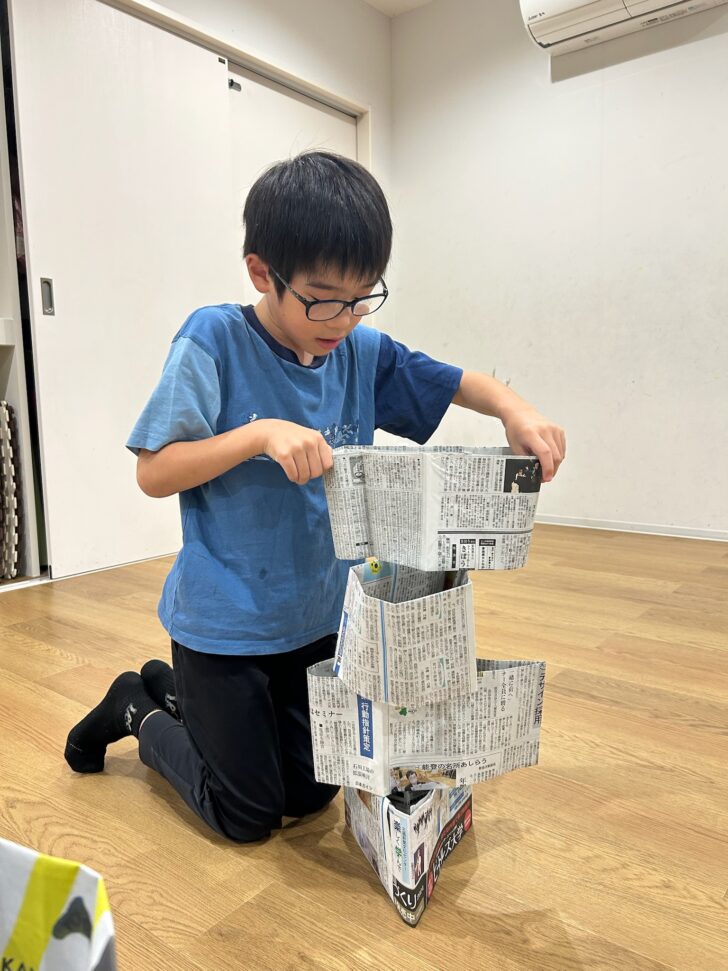 「輪っかにした新聞紙を、どこまで高く積み上げることができるか?」というゲームです!