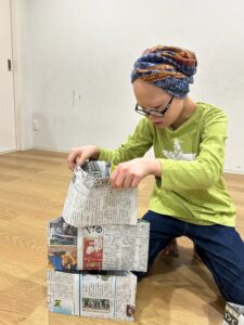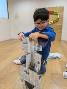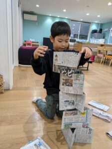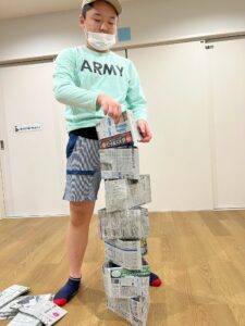 「輪っかにした新聞紙を、どこまで高く積み上げることができるか?」というゲームです!