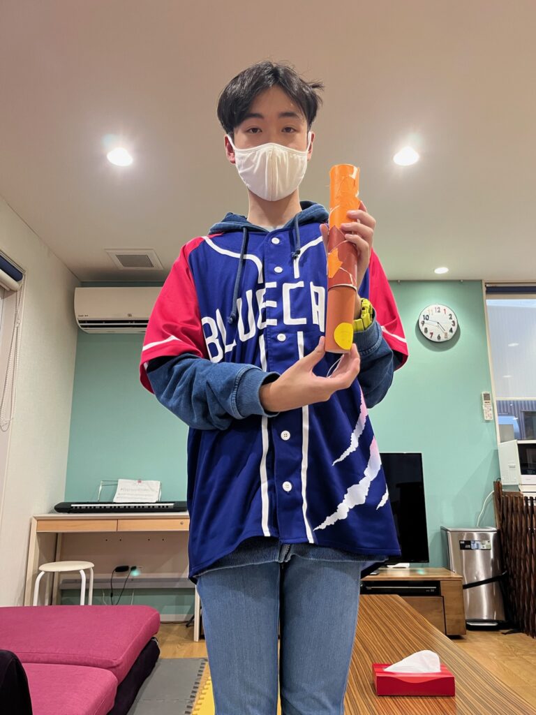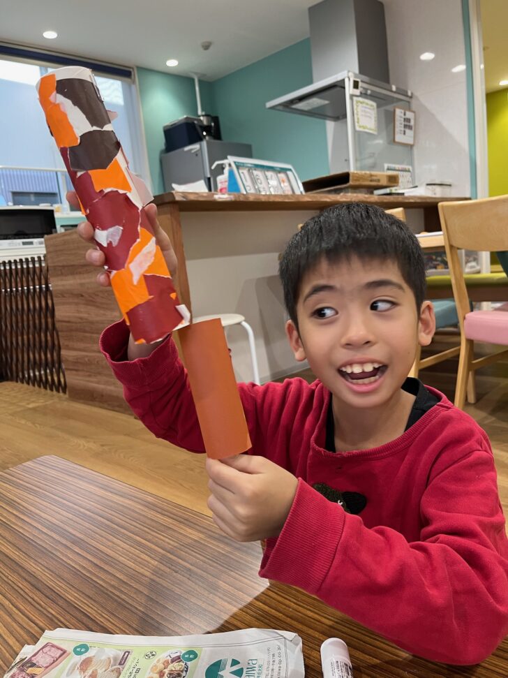 できたらトイレットペーパーの芯の中に通しテープでとめたあとは、