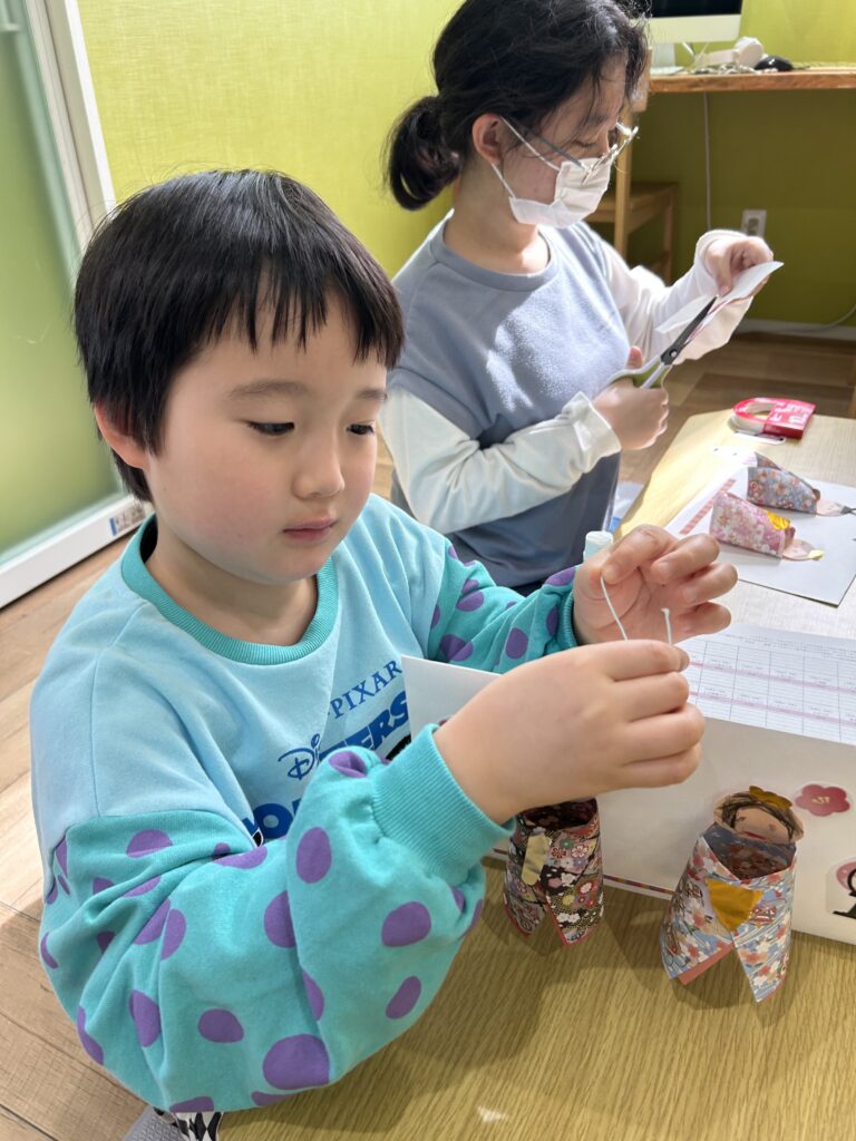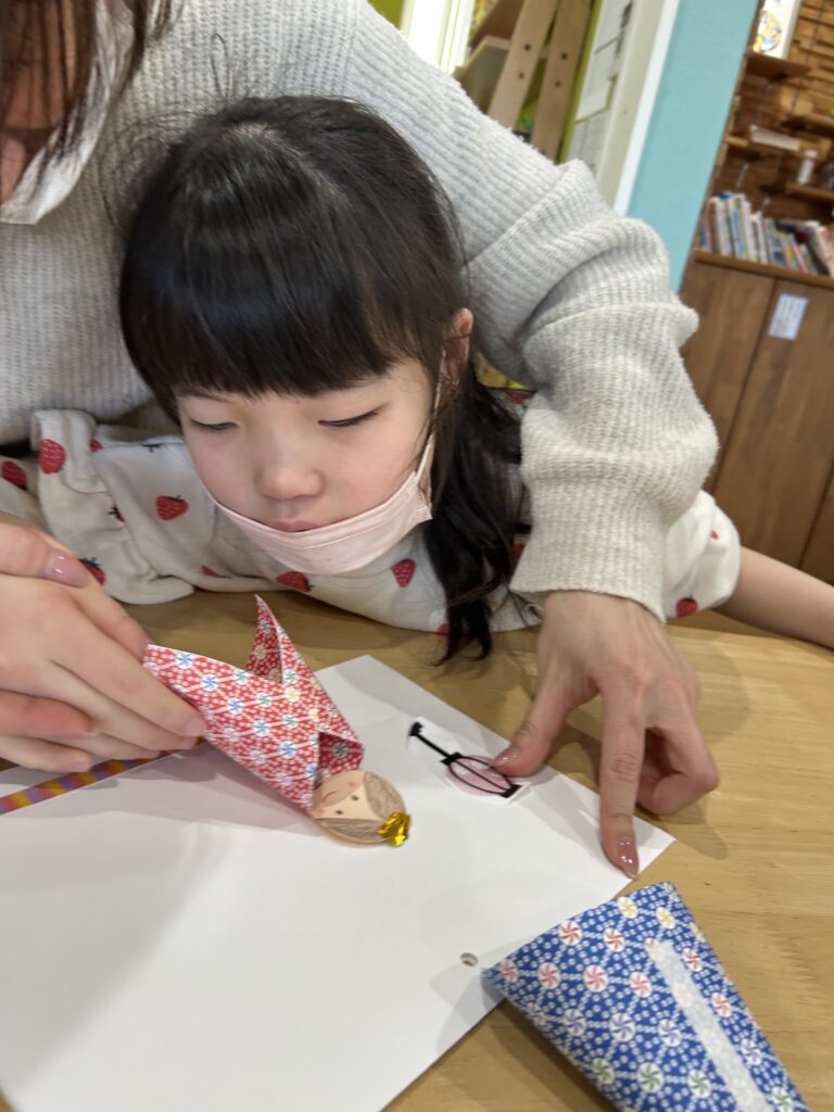 好きな千代紙を選んで2つに折ったら、くるりと丸めて素敵な着物を着せてあげましょう✨