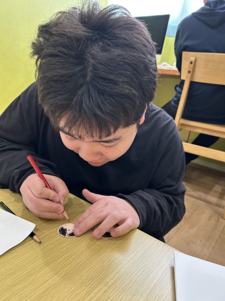 画用紙を丸く切ったら、髪や目、口を描いて、お内裏様とお雛様の顔にします。