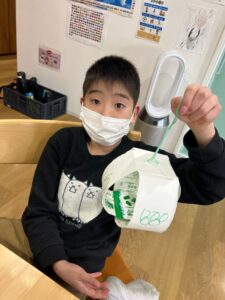 (事前に牛乳パックの底に、2つ穴を開けておきました😉)