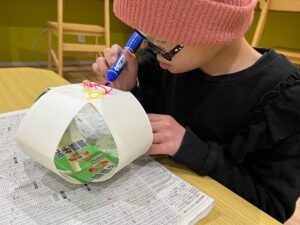 丸くなるように形を整えてテープで固定し、最後に色や模様を描いたら完成!