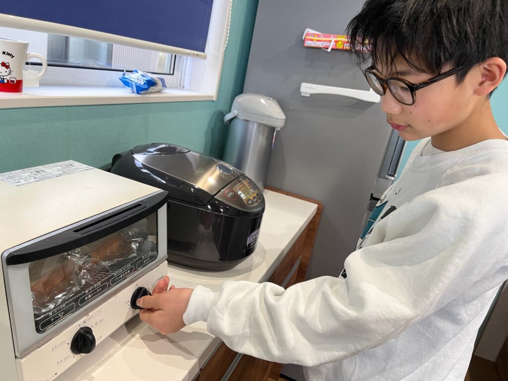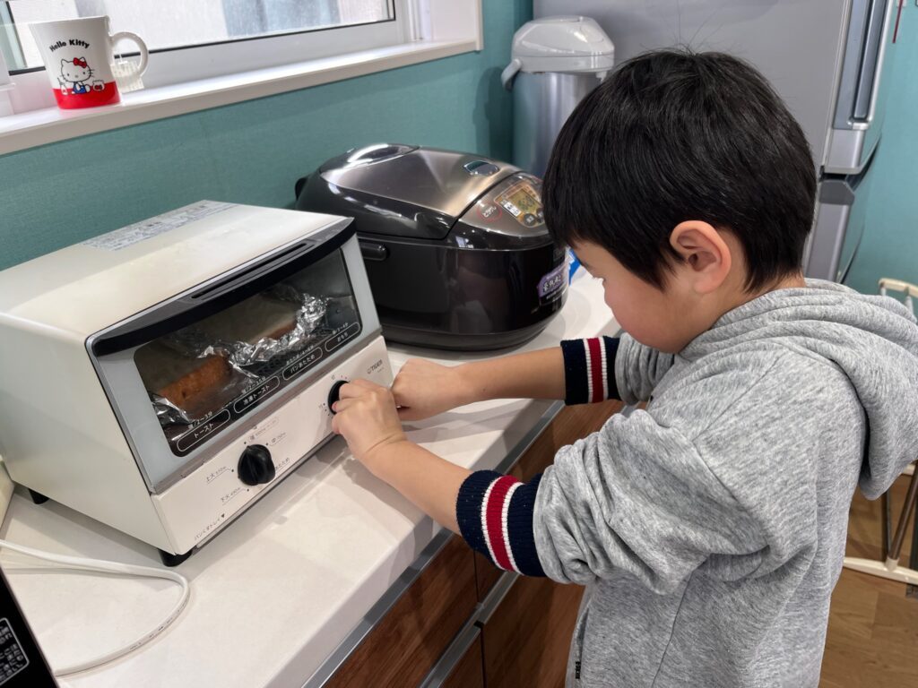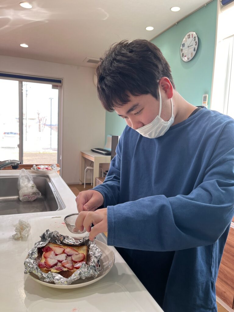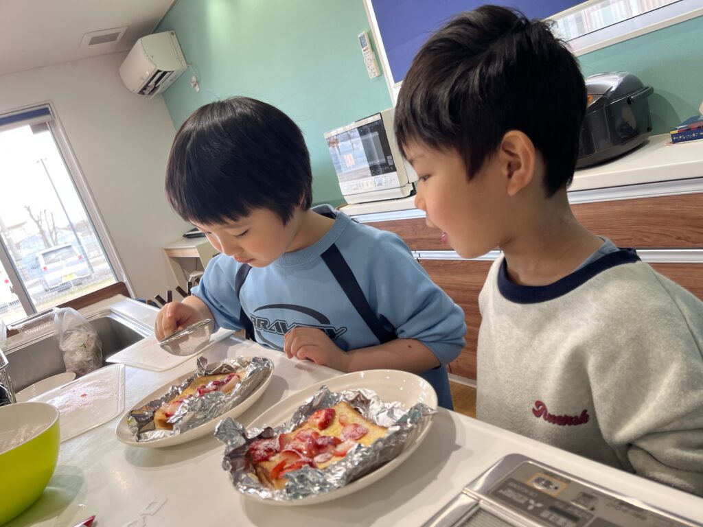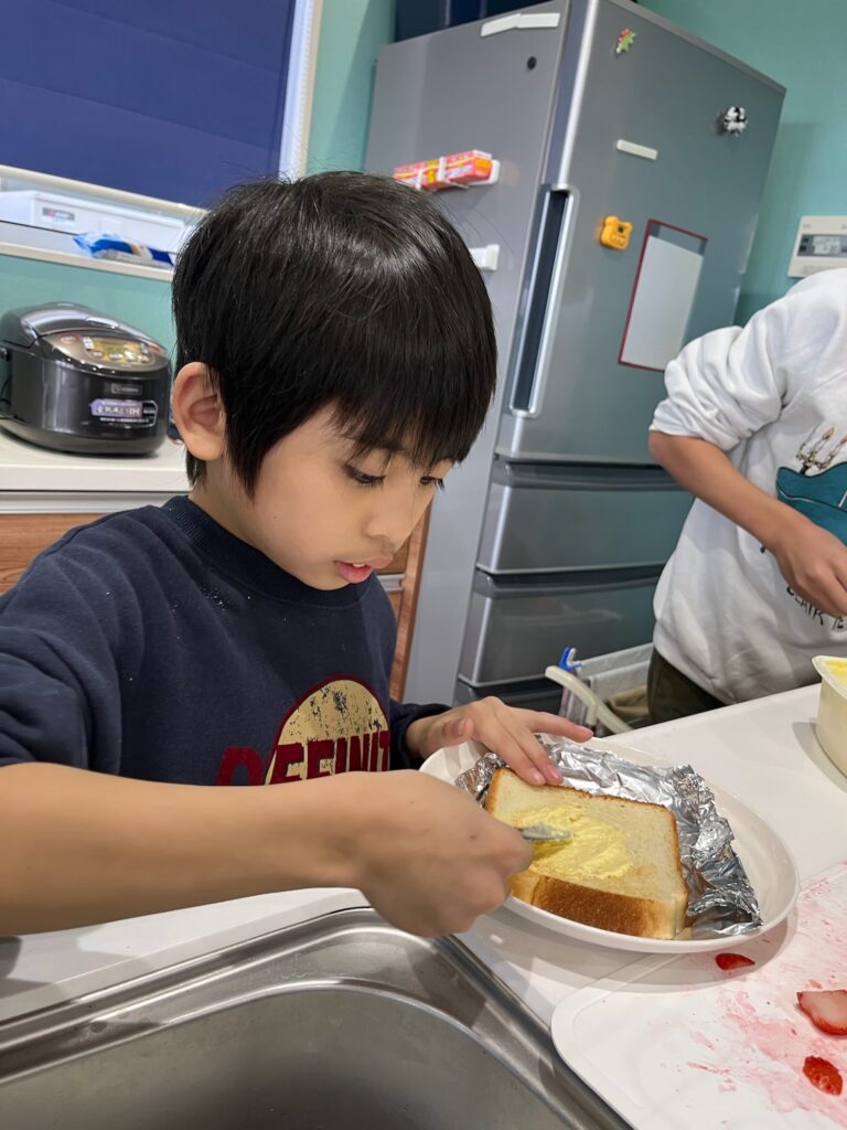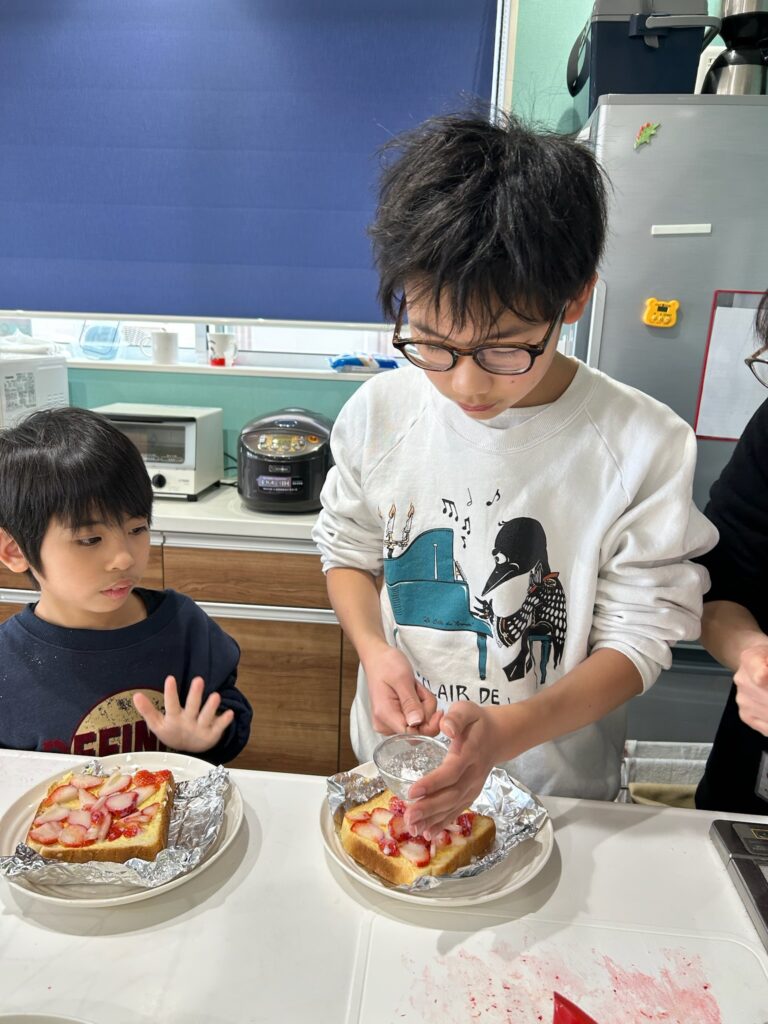 パンが焼けたら、マーガリンを塗り、いちごを並べて、練乳→粉砂糖 をかけていきます😀