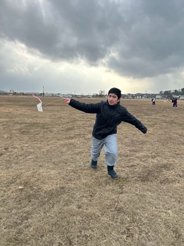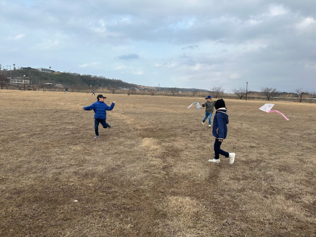 次の週の土曜日、内灘町の広〜い蓮湖渚公園で、思いっきり走って凧揚げを楽しんできました。