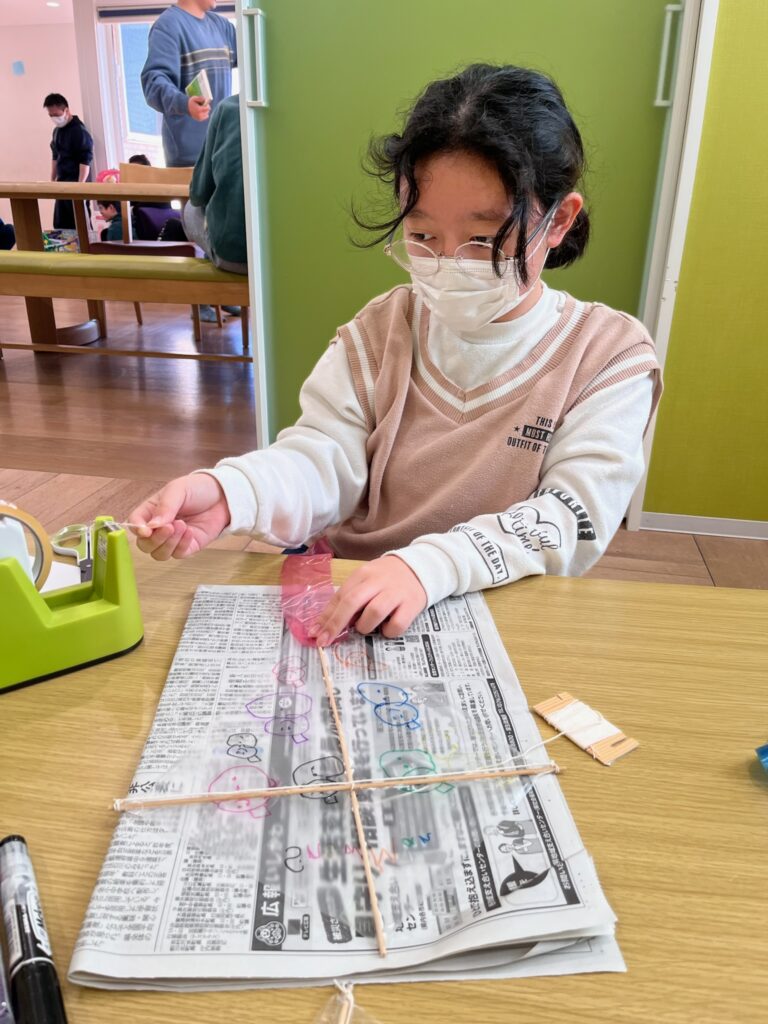 ポリ袋に竹ひごをつけて、タコ糸を結んでいきます。