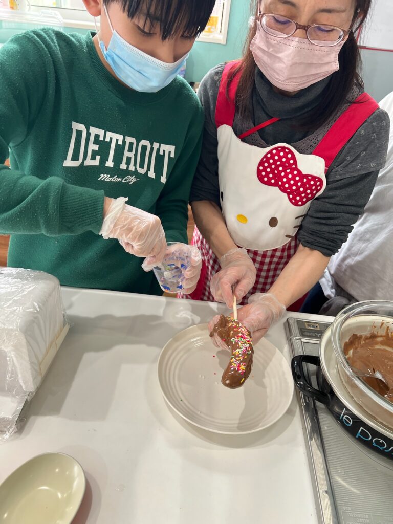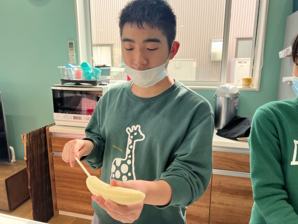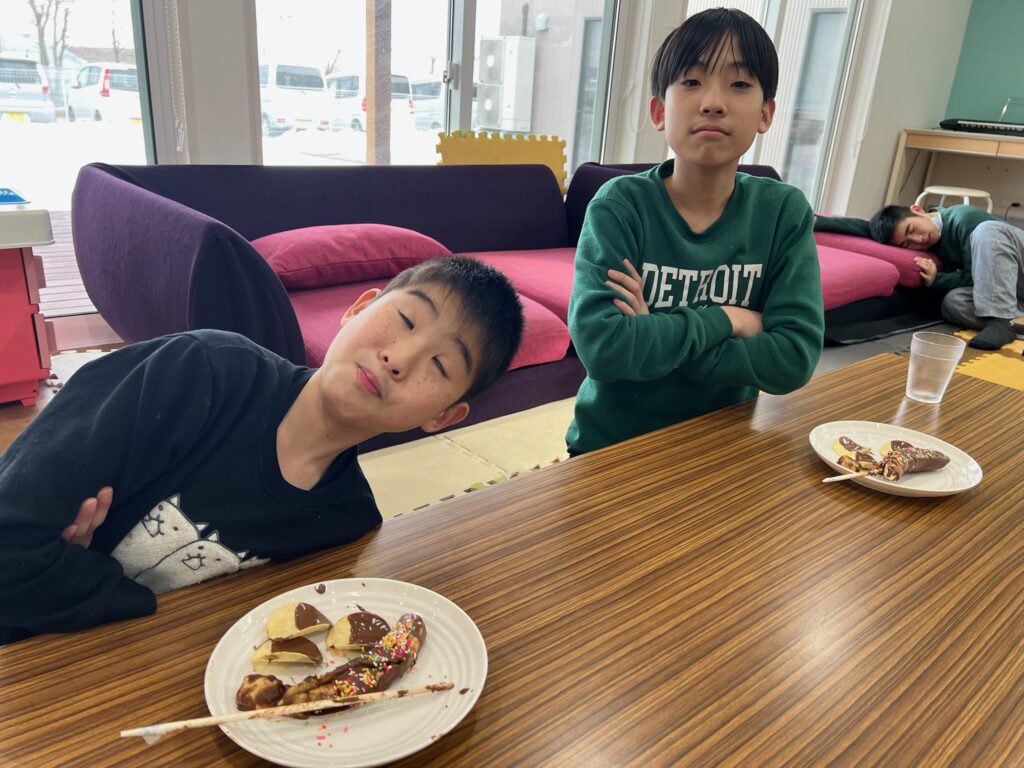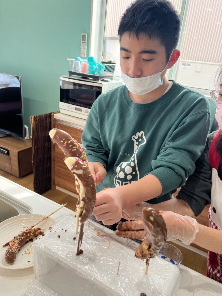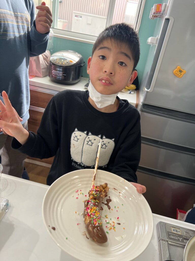 片手にバナナを持ちながら、もう一方の手で、スプーンでとろとろチョコを垂らしていくのはちょっと難しく、手伝ってもらいながら頑張って仕上げていました👍