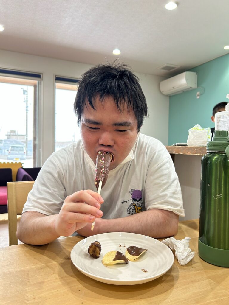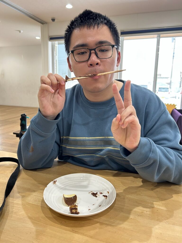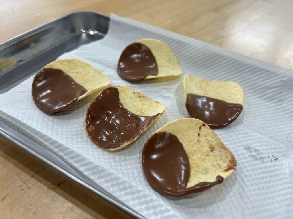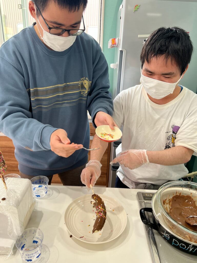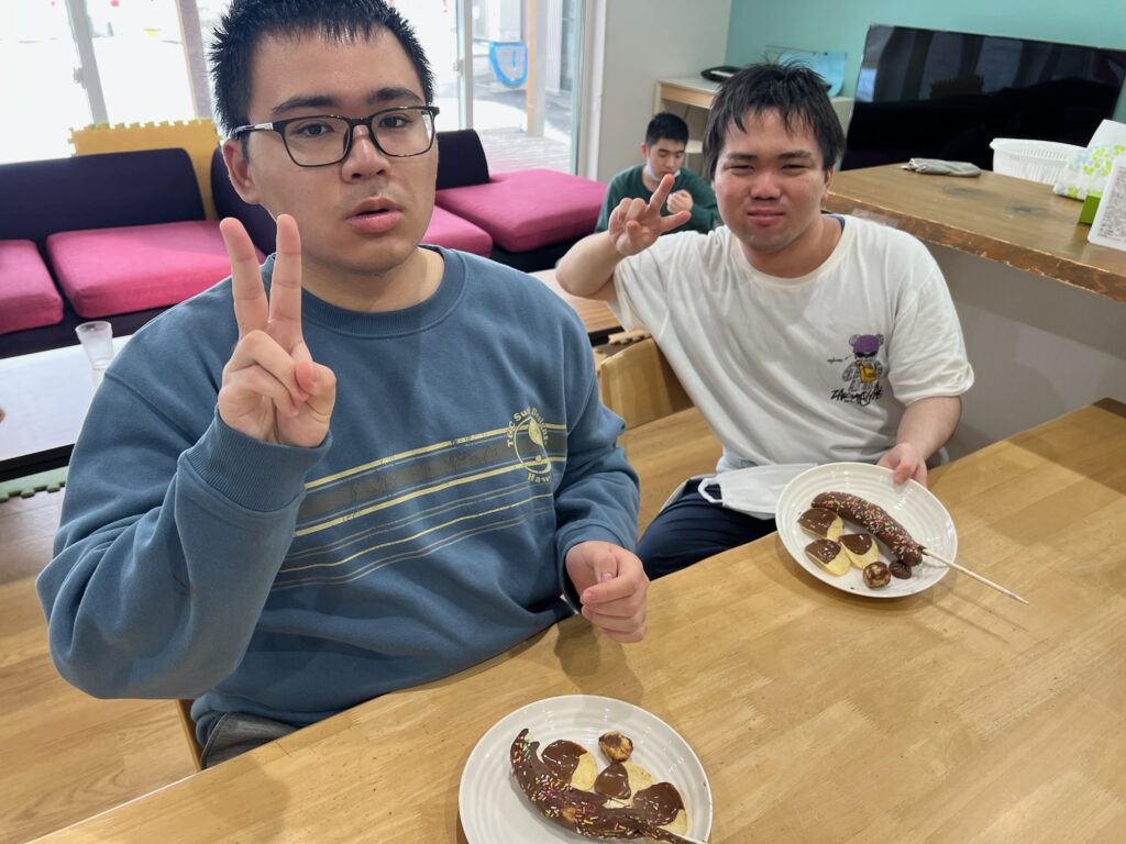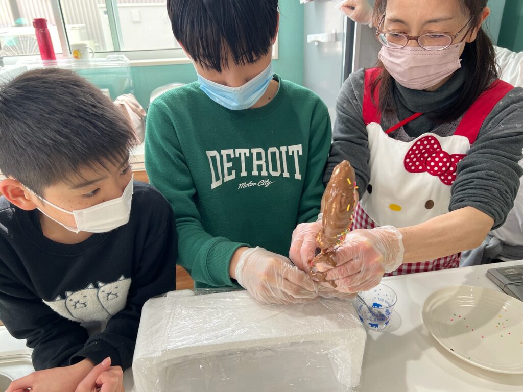 片手にバナナを持ちながら、もう一方の手で、スプーンでとろとろチョコを垂らしていくのはちょっと難しく、手伝ってもらいながら頑張って仕上げていました👍