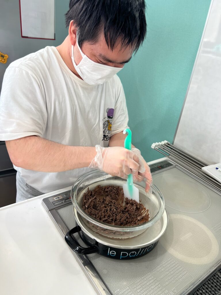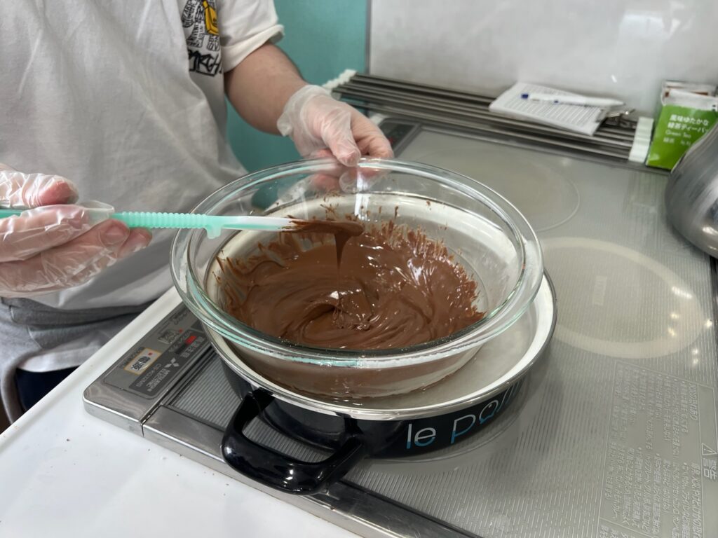 刻みチョコが入ったボールをお湯に入れて、ゆっくり混ぜていこう😃