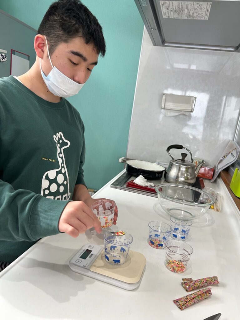 仕上げにかけるチョコスプレーを人数分に計量してくれる子。